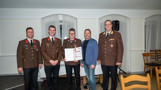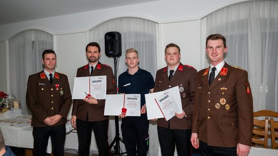 Nach den Berichten standen erfreuliche Programmpunkte auf der Tagesordnung: Zwei neue Jugendmitglieder wurden feierlich angelobt, und drei Kameraden der aktiven Mannschaft erhielten Beförderungen.